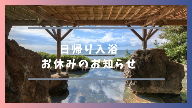 9月27日と9月28日は日帰り入浴をお休みします。 2025年09月27日 お知らせ ツイート 9月27日(土)と9月28日(日)の二日間、日帰り入浴の営業をお休みとさせていただきます。 よろしくお願いいたします。
