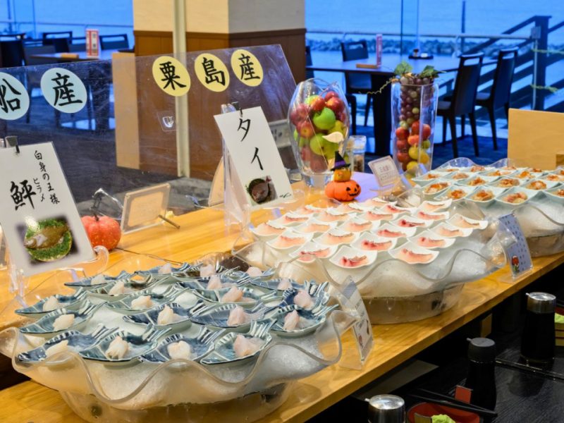 岩船漁港で競り落とした新鮮な魚介類をはじめ、焼きたての玉子焼き、寒い季節に嬉しい新潟の郷土料理「のっぺい汁」、地元で人気のヤスダヨーグルトなど当館自慢のこだわりメニューをビュッフェ形式でお召し上がりください。