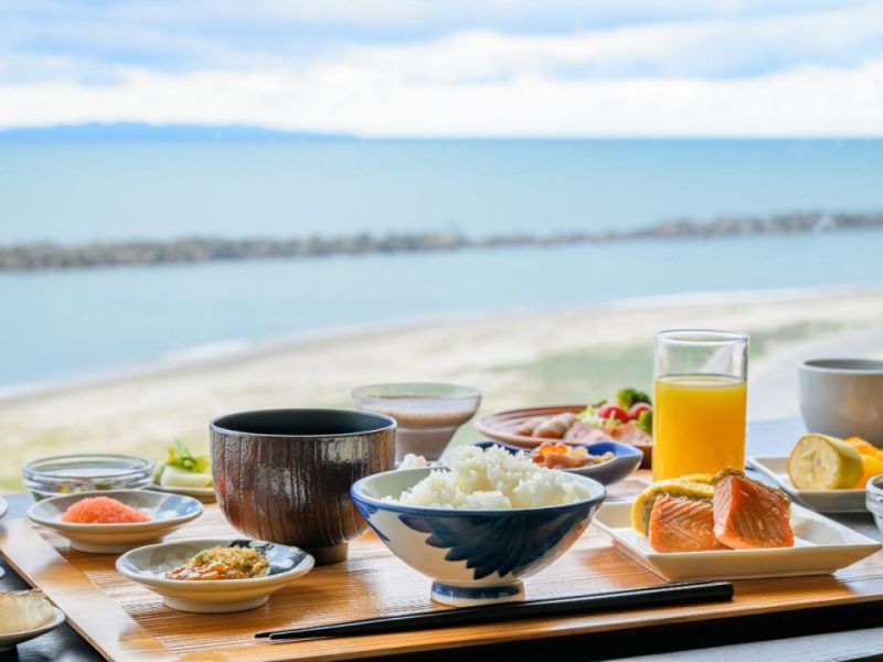 当館の朝食は、窓いっぱいに広がる日本海の雄大な絶景ロケーションと共に、新潟・村上の地元食材にこだわった朝食バイキングをご用意しております。