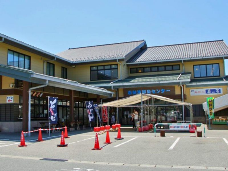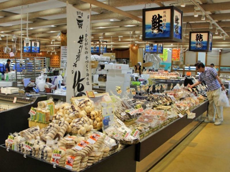 瀬波温泉街の立ち寄りどころの一つです。広々とした店内には、岩船港に水揚げされた新鮮な地魚をはじめ、手づくりの「いよぼや(鮭)の味噌漬」や、村上名産の「塩引鮭」など地場名産品が豊富に揃います。