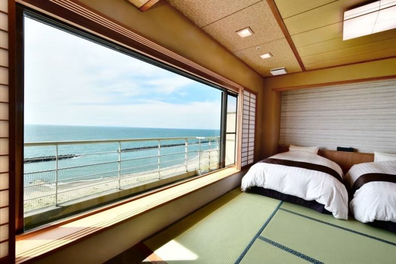 大きな窓の向こうに広がるのは、雄大な日本海の絶景。水平線に沈む夕陽を眺めながら、畳の上で足を伸ばして寛ぐ贅沢なひとときをお過ごしいただけます。