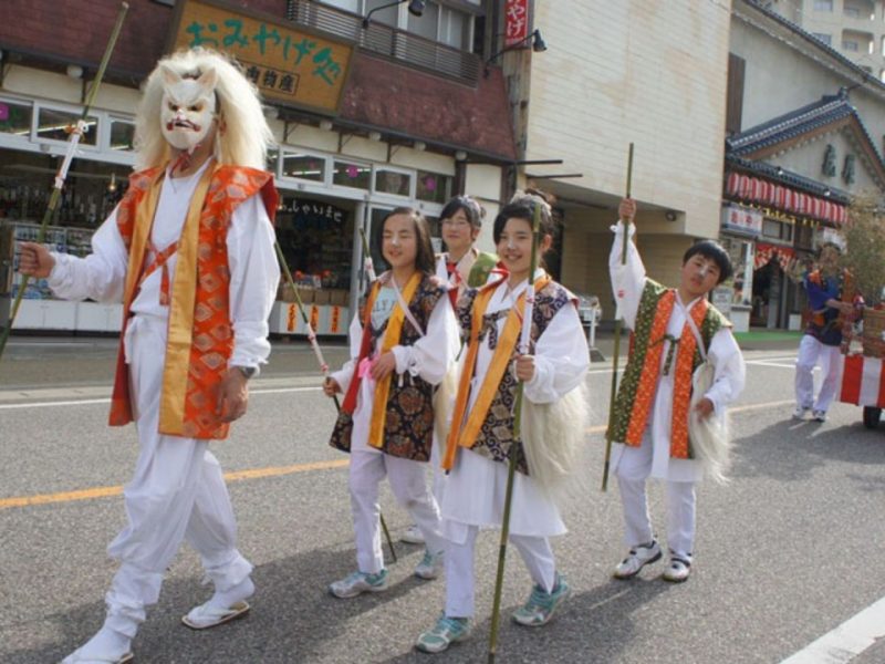 その昔、温泉が湧き出す前夜にキツネたちが集まり、しきりに鳴いて知らせたという伝説から、お狐様を「福招きの使者」として慕い、今日まで大切に受け継がれてきたお祭りです。